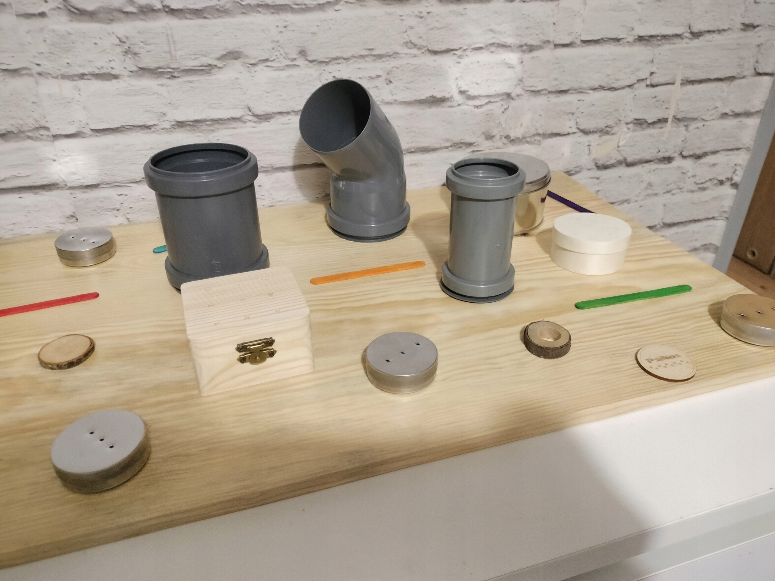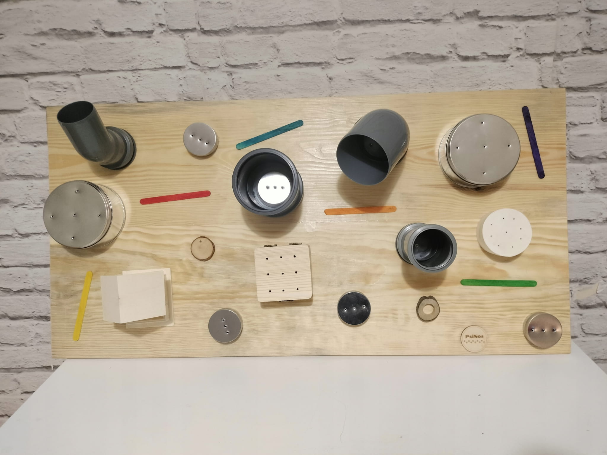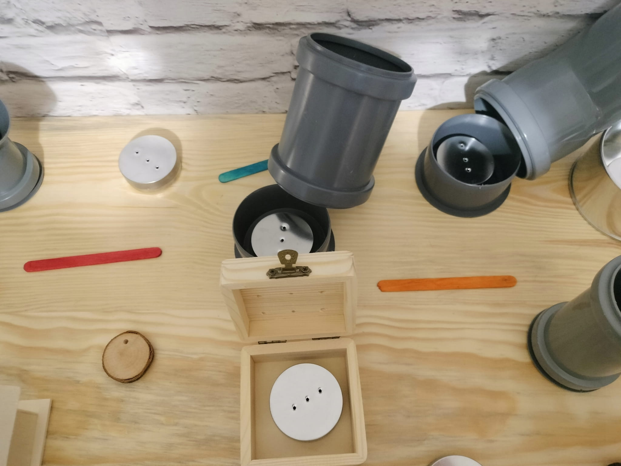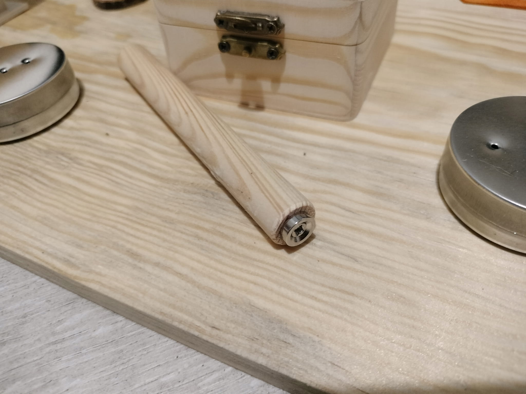 - Okrągły pojemnik ze sklejki z otworami (7/3 cm) z magnetyczną puszką 50/16 mm w środku