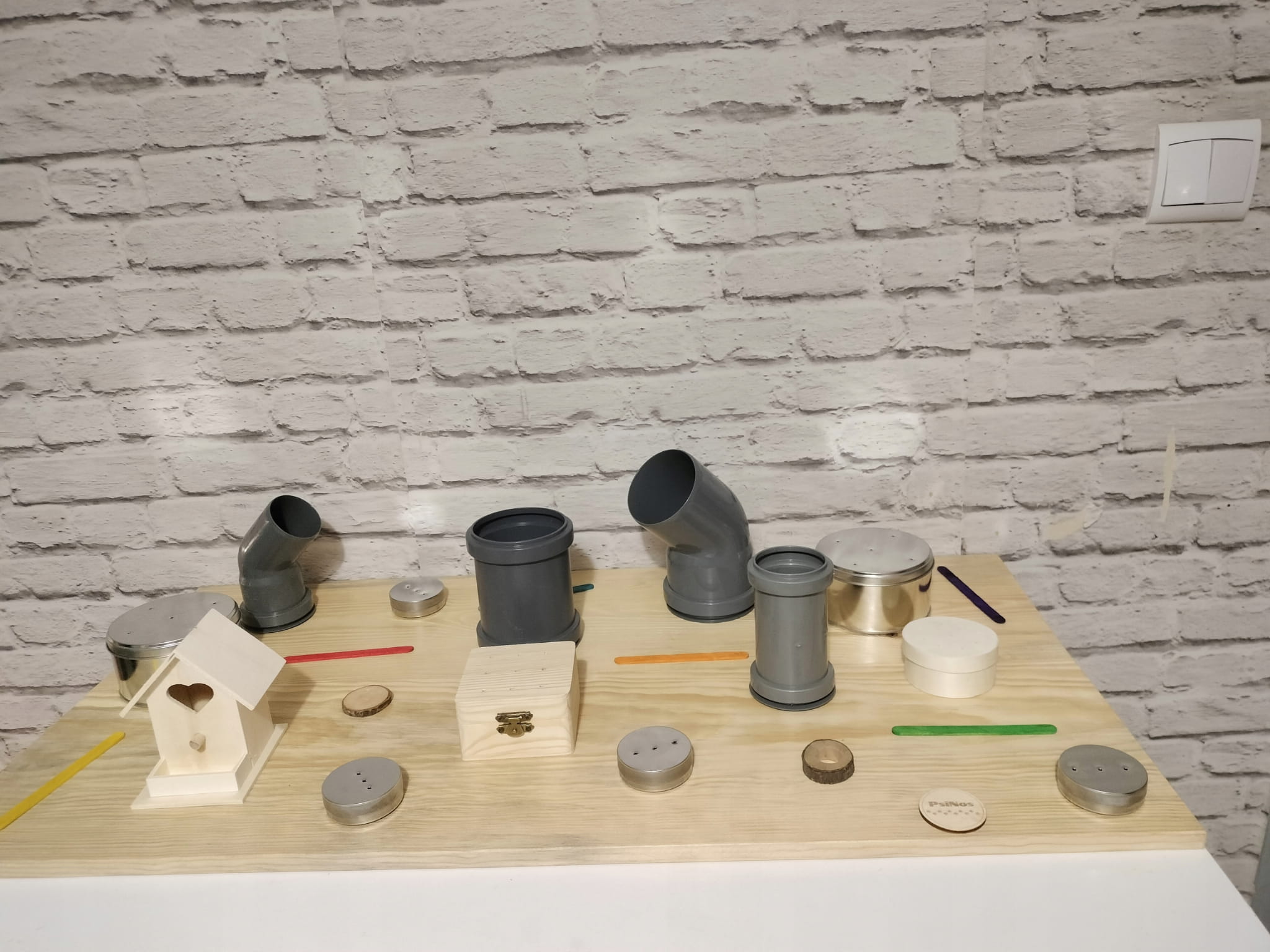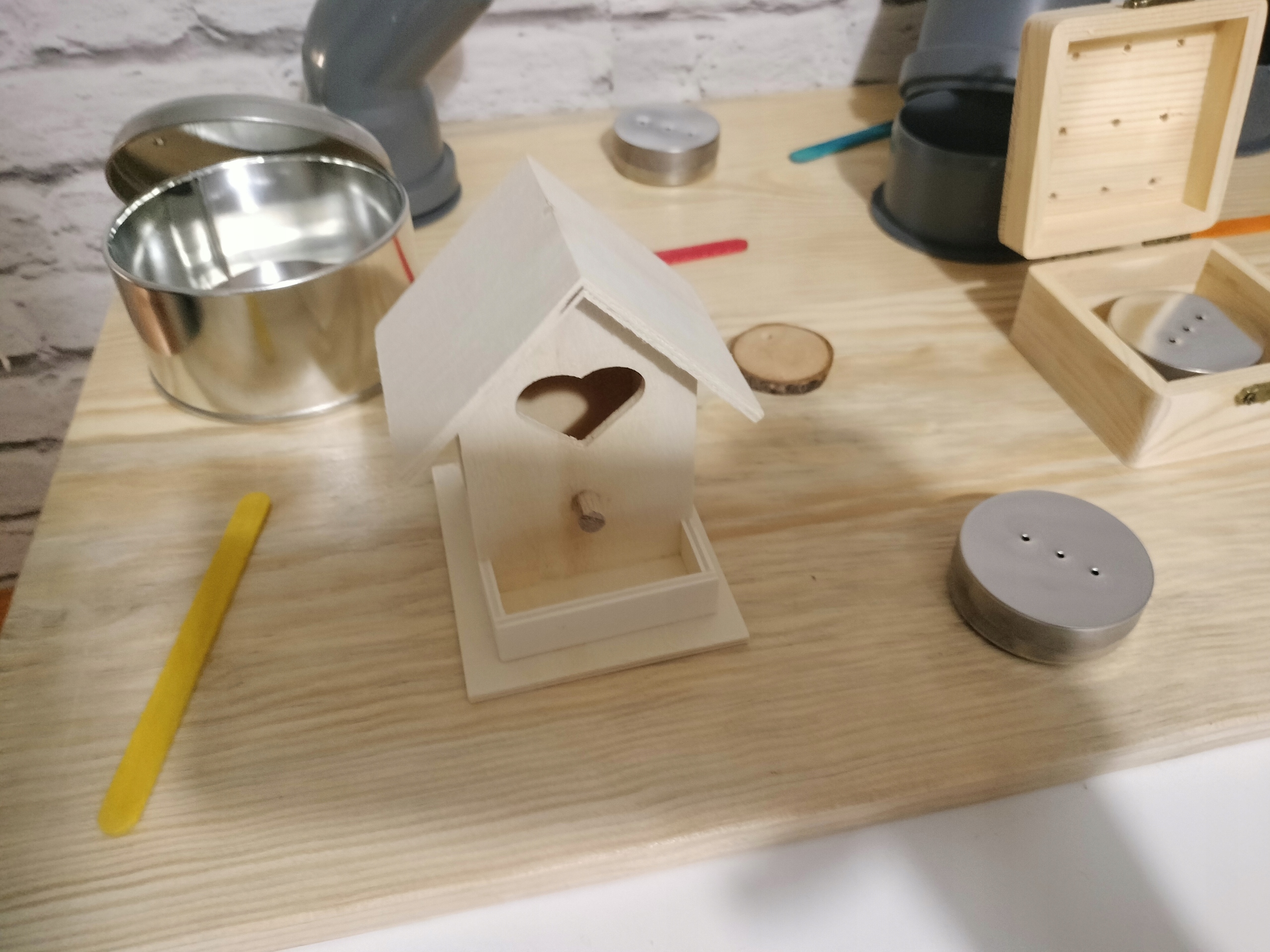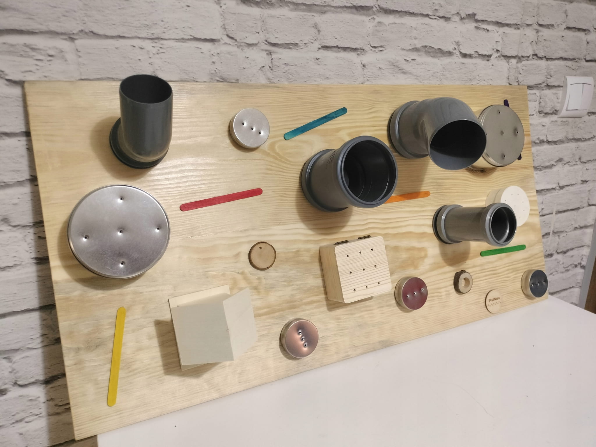 - Okrągły pojemnik ze sklejki z otworami (7/3 cm) z magnetyczną puszką 50/16 mm w środku