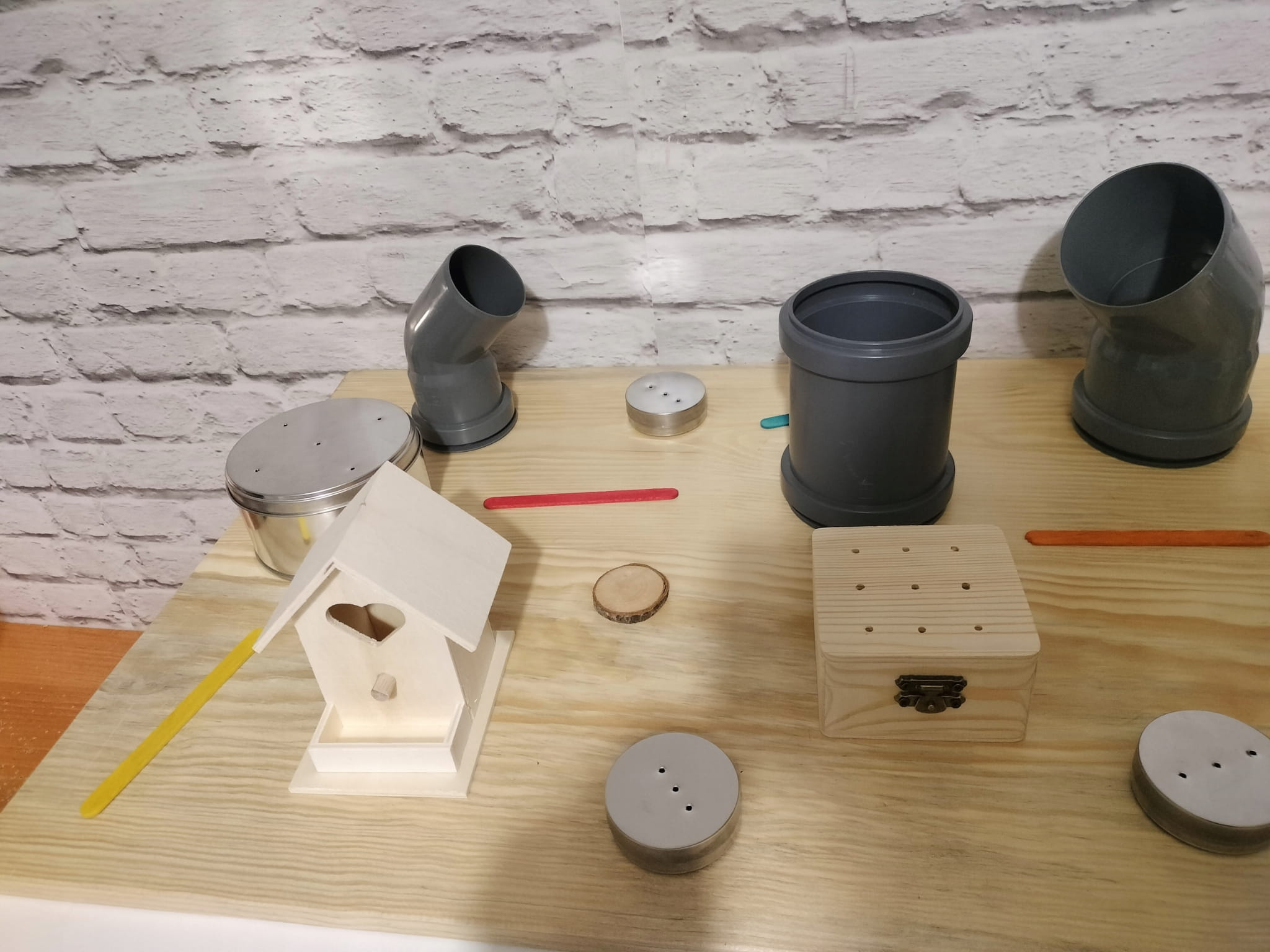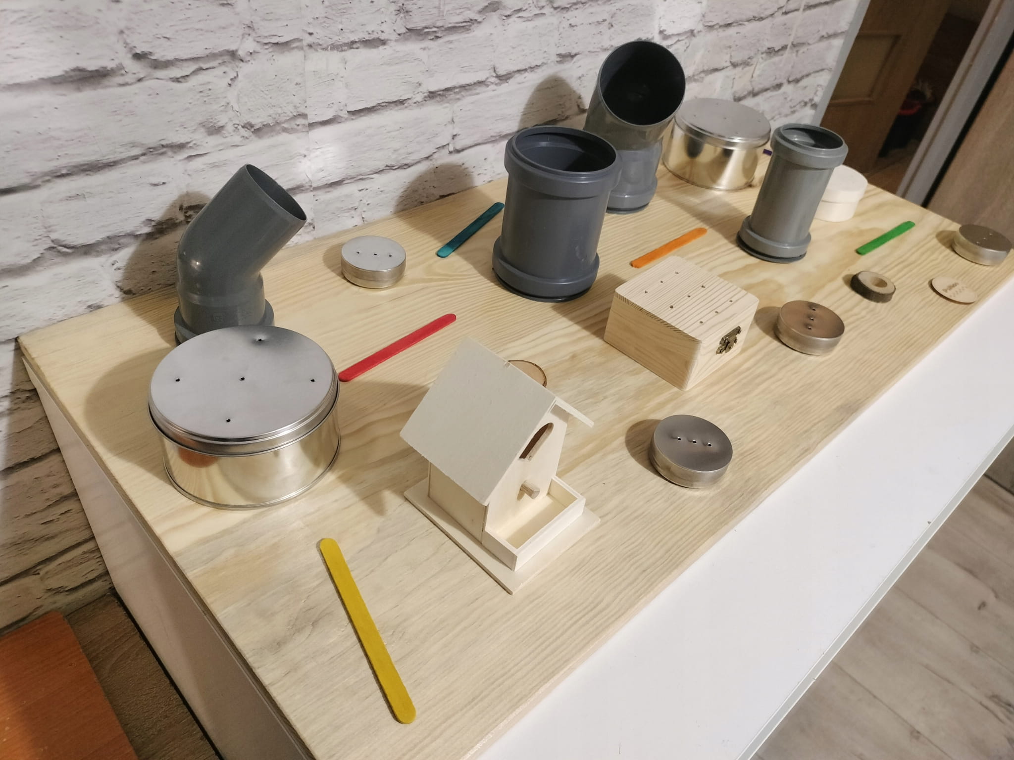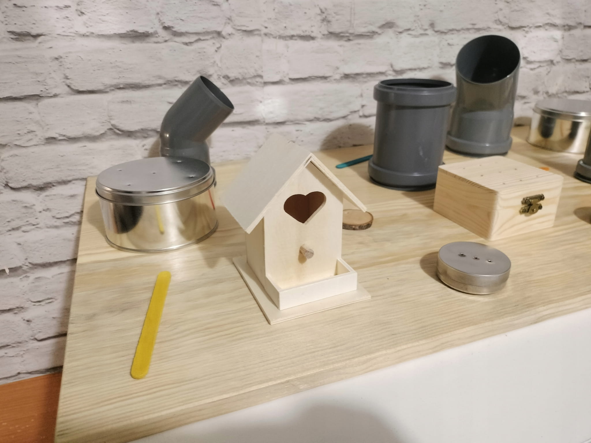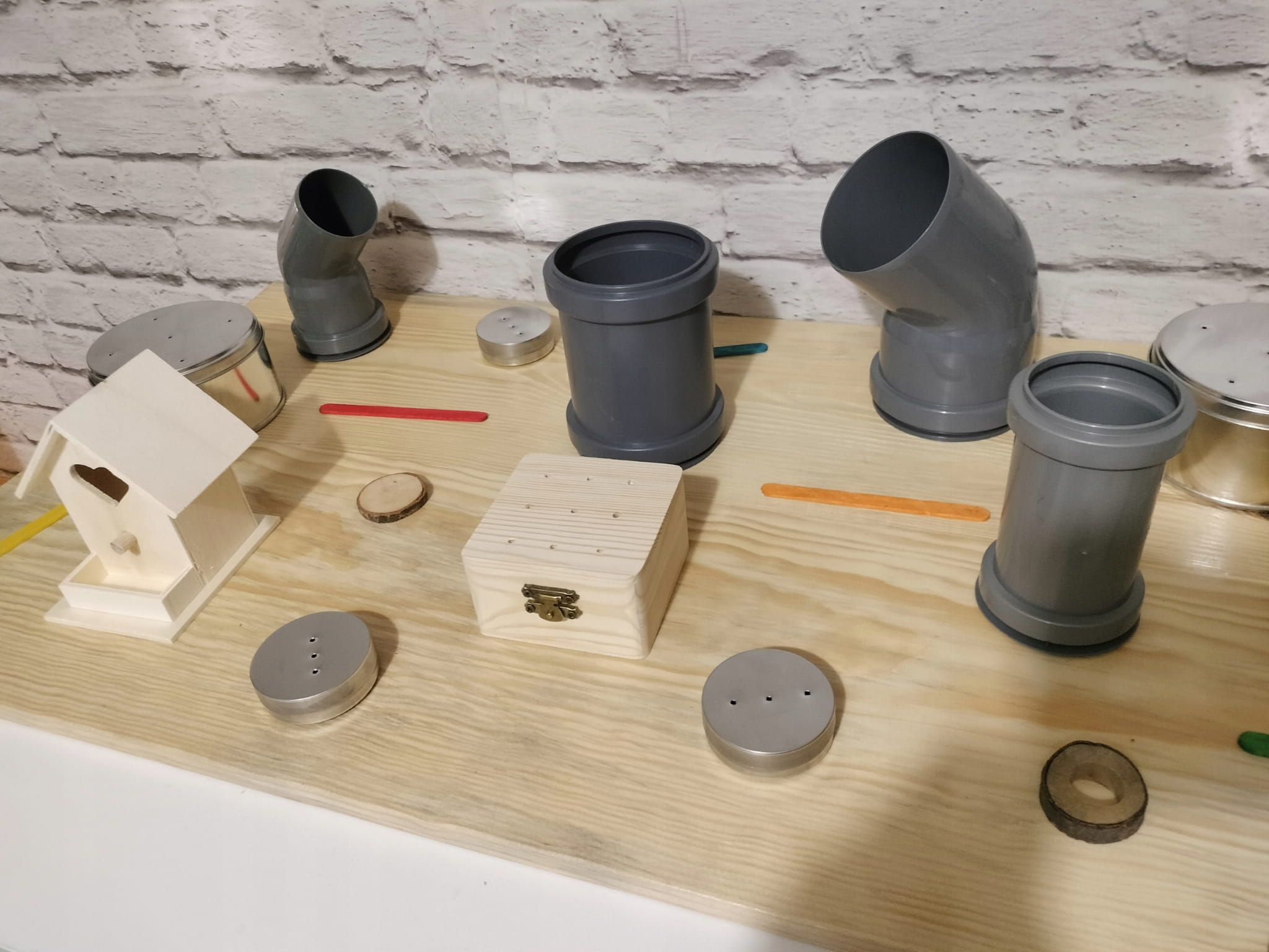 - Okrągły pojemnik ze sklejki z otworami (7/3 cm) z magnetyczną puszką 50/16 mm w środku