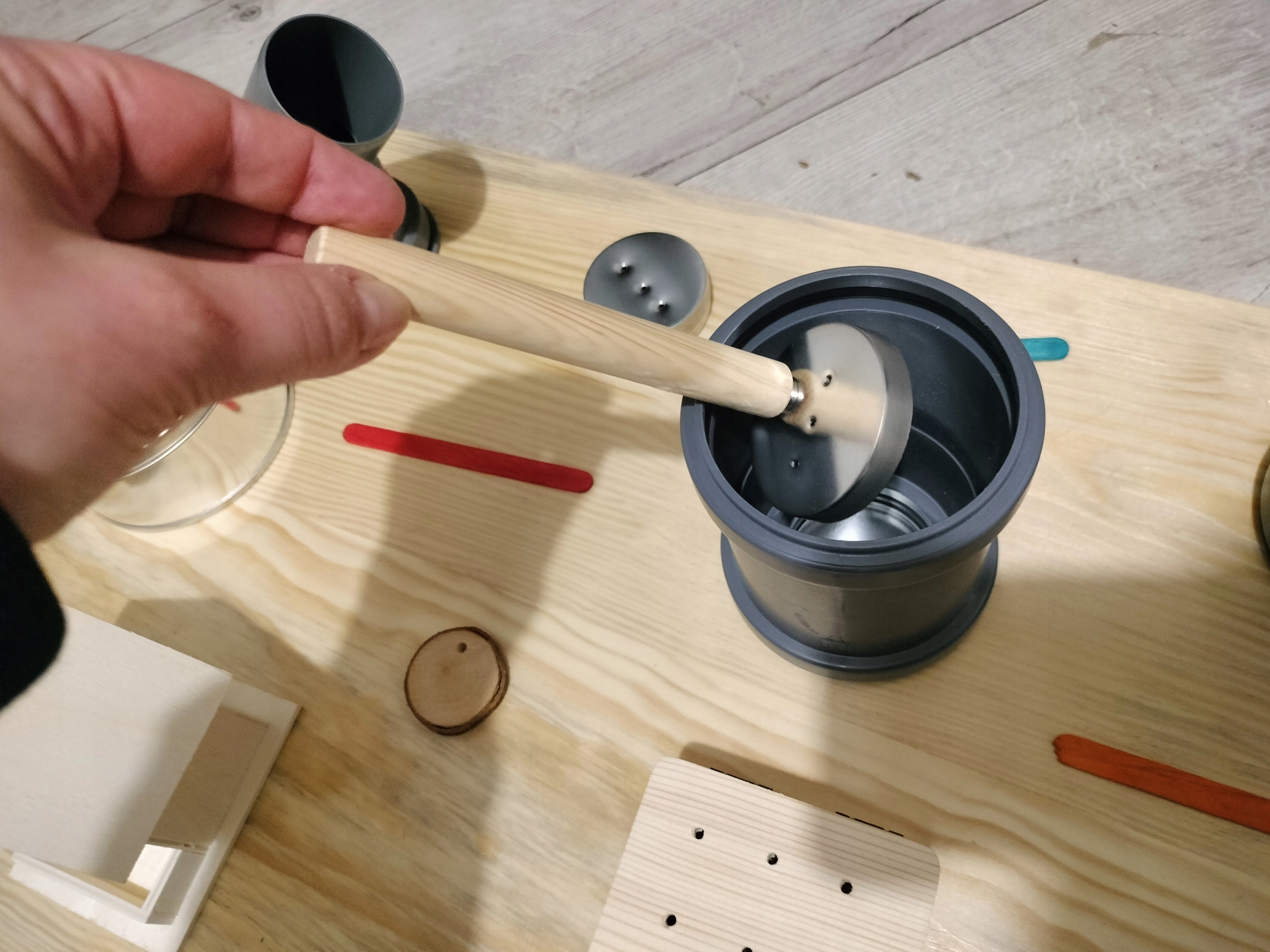 - Drewniany patyk z magnesem umożliwiający bezdotykowe wyciąganie puszek z zapachem