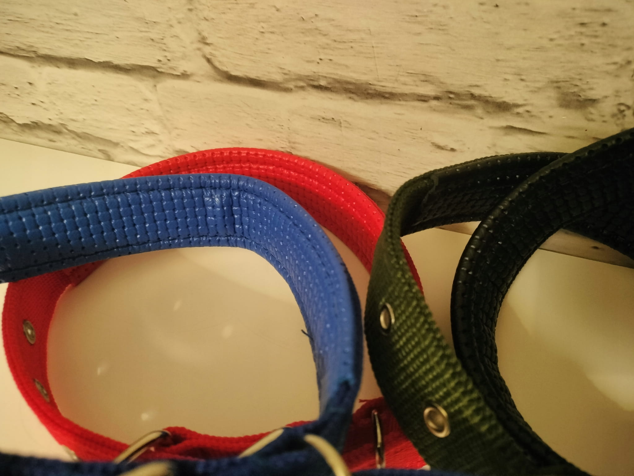 Obroża jest z taśmy parcianej, natomiast część wewnętrzna na krtani psa podszyta eko skórą aby była milsza w dotyku, tym bardziej w trakcie ewentualnych szarpnieć